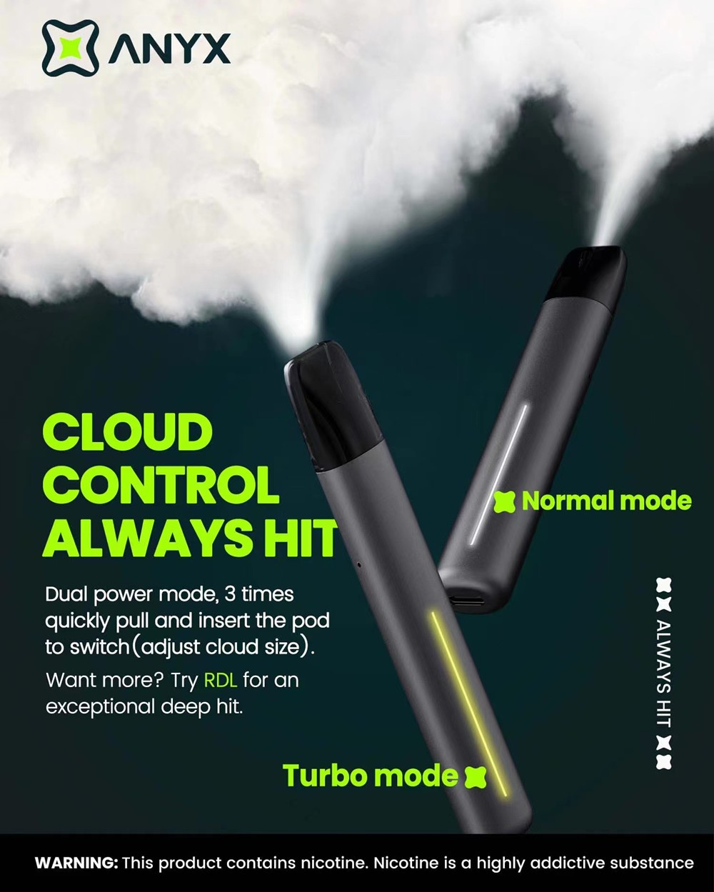 A világ első igazi kétmódusú zárt pod rendszereként az ANYX PRO MCU intelligens hőmérséklet-szabályozó chippel van felszerelve, és támogatja a Restricted Direct-Lung (RDL) módot, azonnali, de jelentősen eltérő élményt nyújtva a választott módtól függően: A Turbo mód erős és sűrű íze, a Normál mód finom és lágy élménye mellett. Az ANYX PRO-t úgy tervezték, hogy kielégítse a gőzök változatos preferenciáit, gazdagabb ízélményt ígérve.
