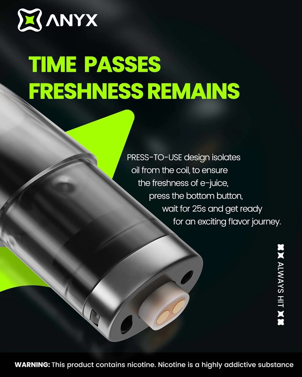 A porlasztók elöregedésének kezelésére, amely ronthatja a felhasználói élményt, az ANYX PRO egy coil-e-liquid elválasztó szerkezetet alkalmaz, amely megakadályozza az e-juice tárolására használt tekercs és a porlasztott folyadék közötti hosszan tartó érintkezés okozta ízváltozást. Használat közben a termék nem csak a párologtató által biztosított friss ízt garantálja, hanem hatékonyan elkerüli a porlasztott folyadék kiszivárgását is.