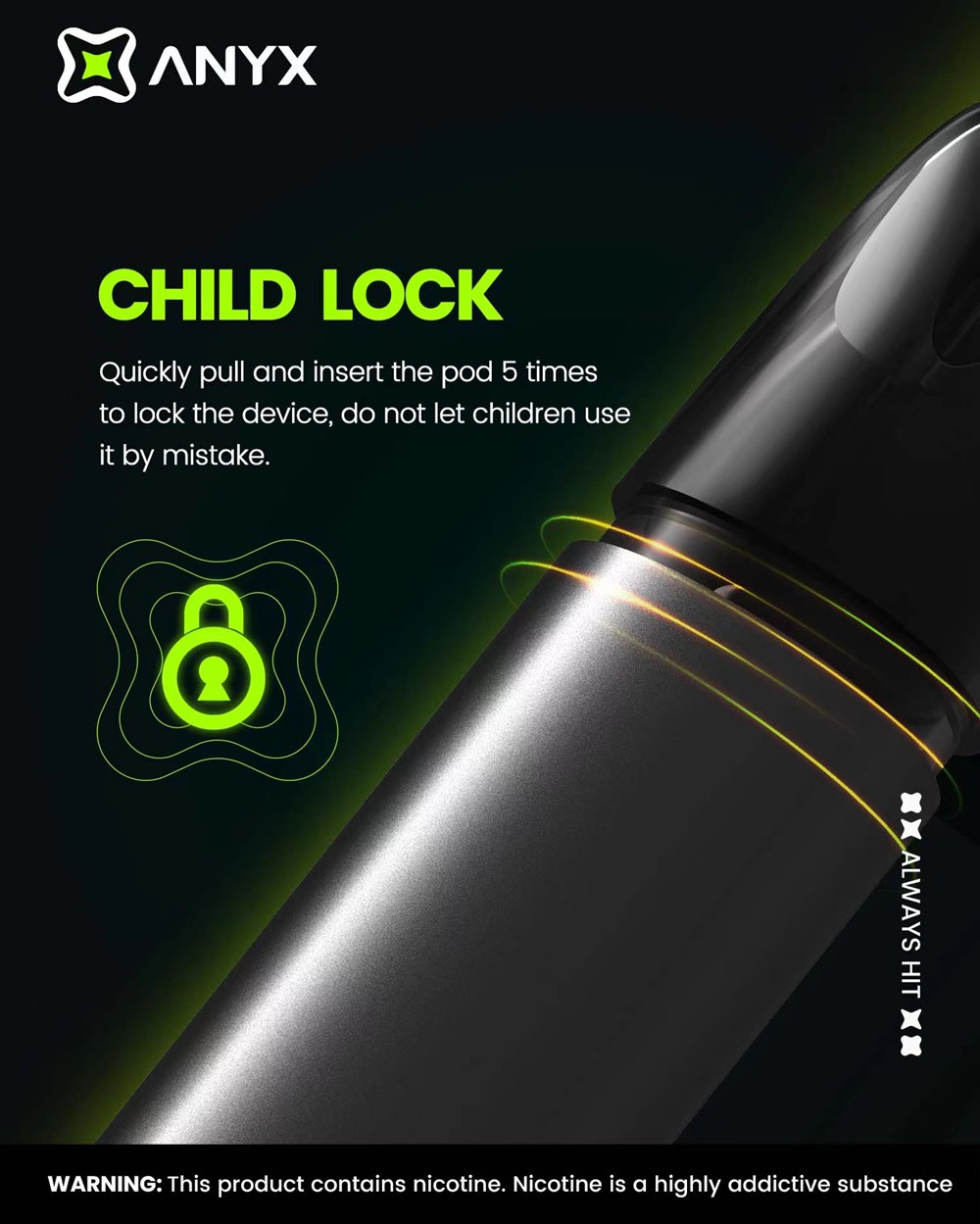 A biztonság és a megbízhatóság maximalizálása érdekében az ANYX PRO gyermekzár funkcióval rendelkezik, amely megakadályozza, hogy kiskorúak kezeljék és használják a terméket.